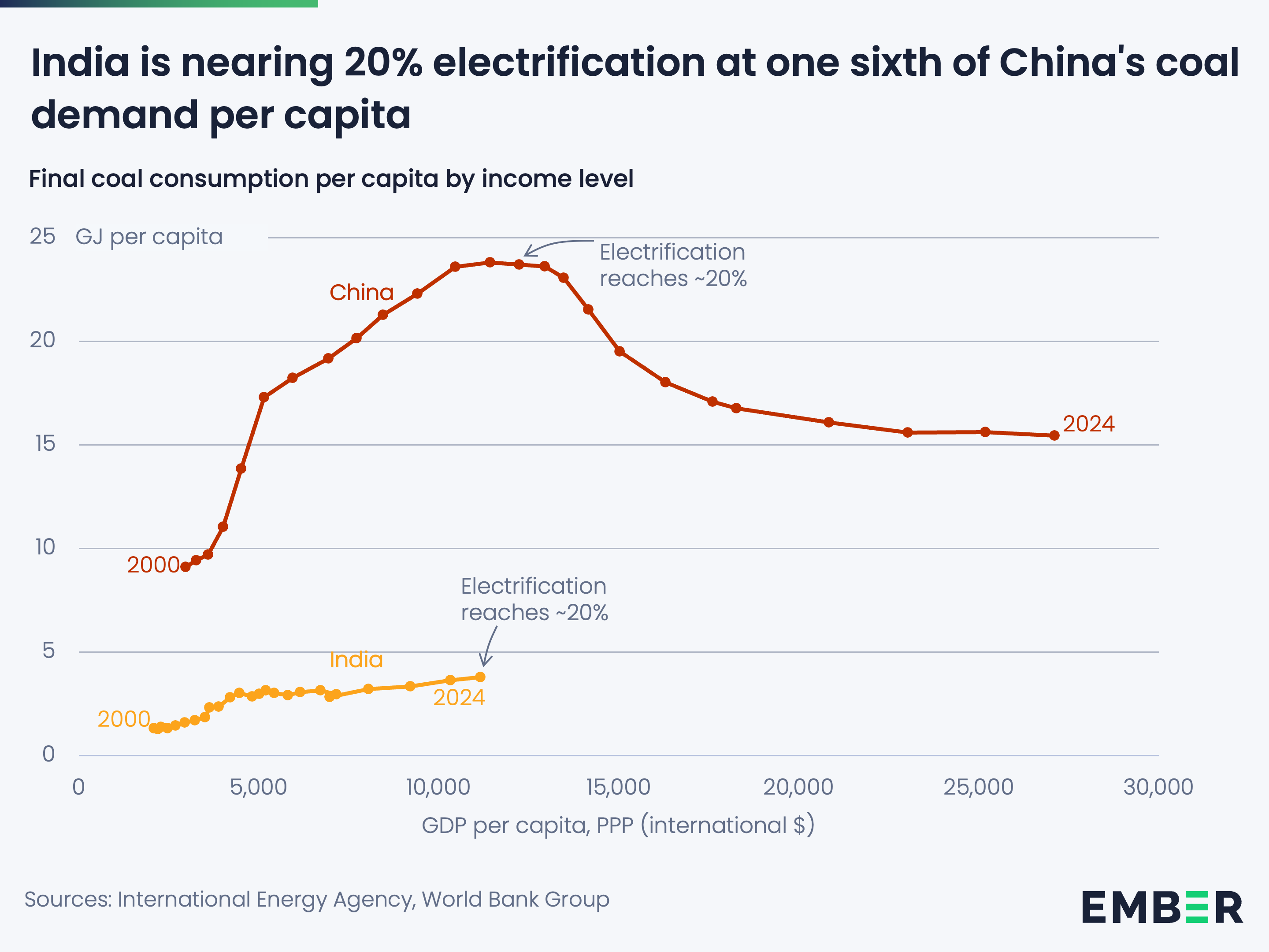 Turning next to the competition between electricity and fossil fuels to provide final energy. India is making strides here too. Electricity has reached 20% of final energy at just 4 gigajoules (GJ) of coal per capita, versus 24 GJ when China crossed the same threshold. At a similar level of development, India has reached the same milestone using roughly one-sixth of the coal.