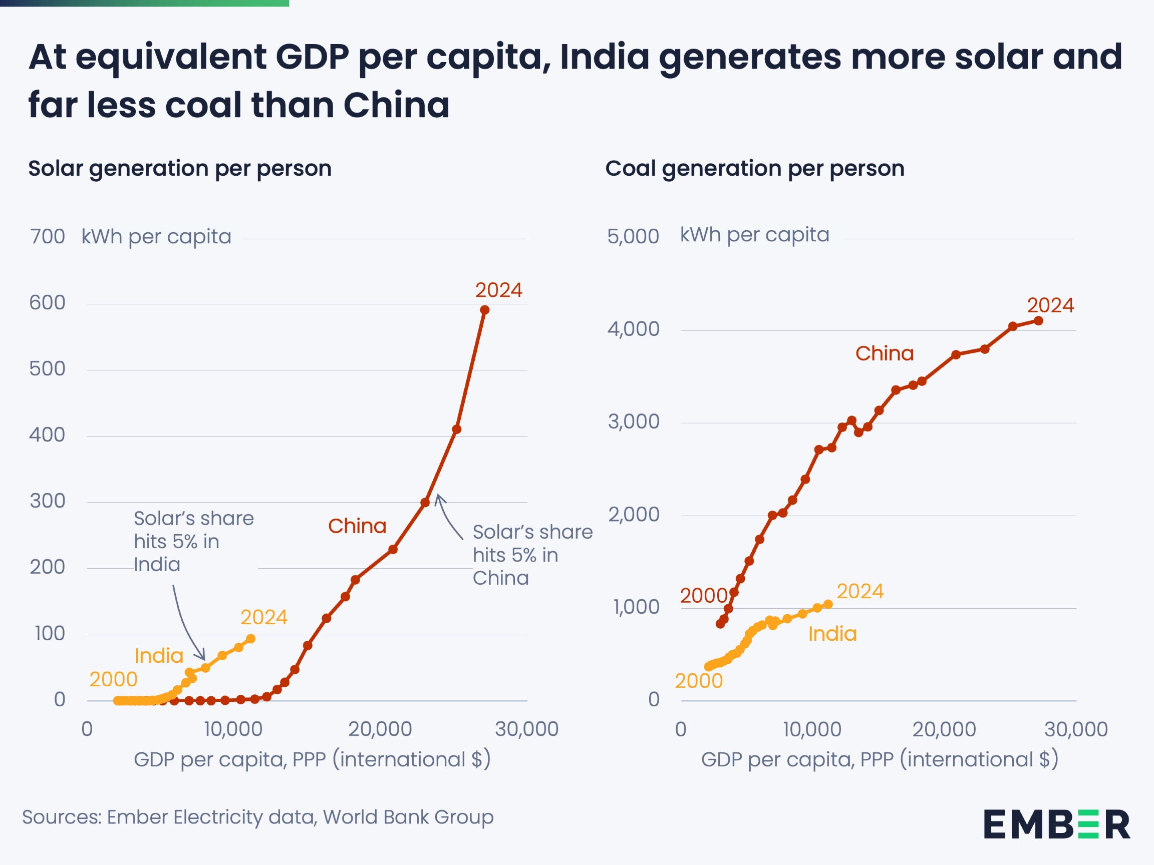 It is more reasonable to compare the two countries at equivalent levels of development. When we do so, a different story emerges. India is generating more solar electricity, burning far fewer fossil fuels and electrifying transport faster than China did at an equivalent GDP per capita.