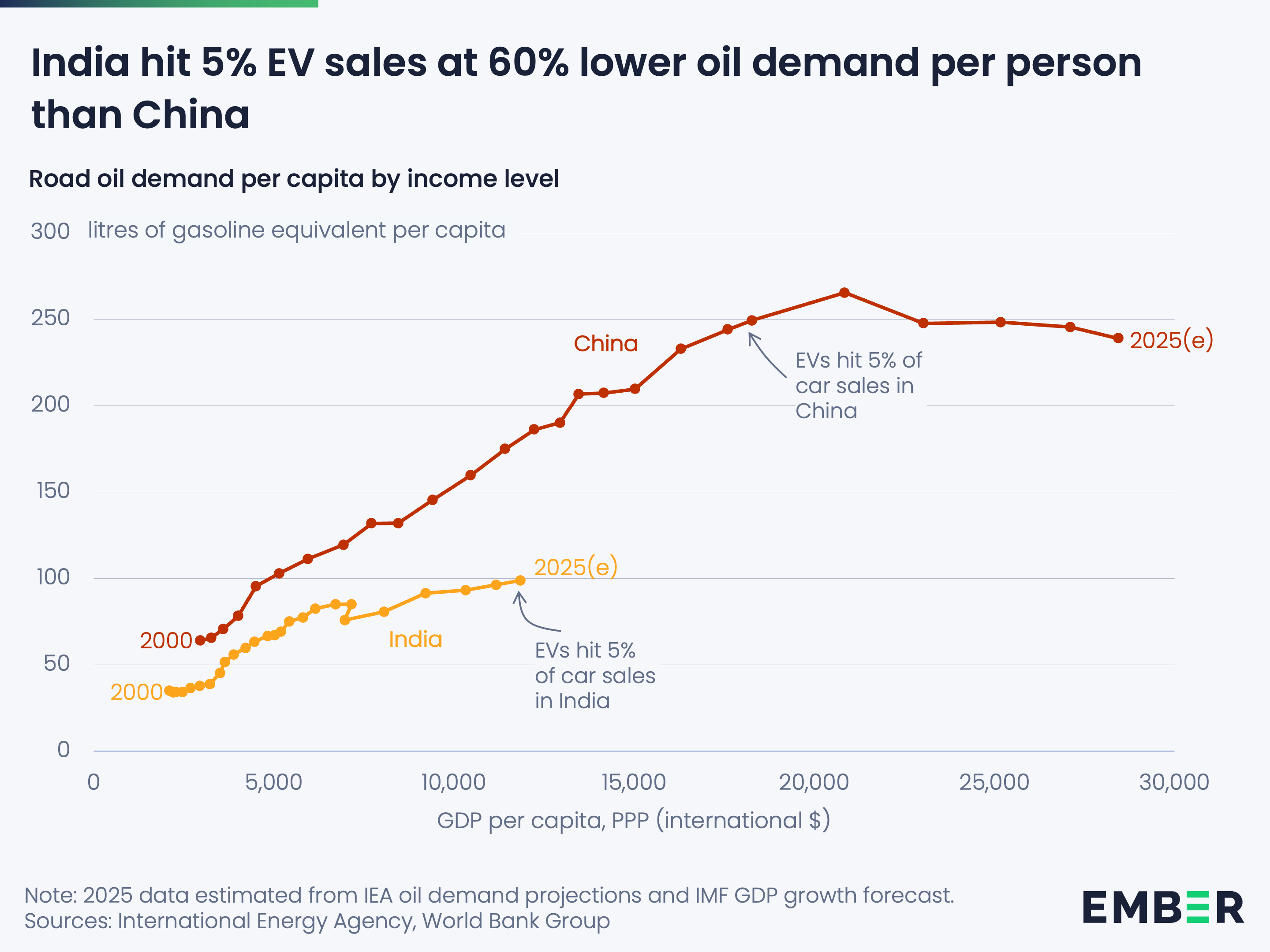 In the race to curb oil imports, India is already far ahead of where China was at the same stage of development. Road transport oil demand per capita is significantly lower, thanks first to smaller, lighter vehicles and now to the rise of electric vehicles (EVs).