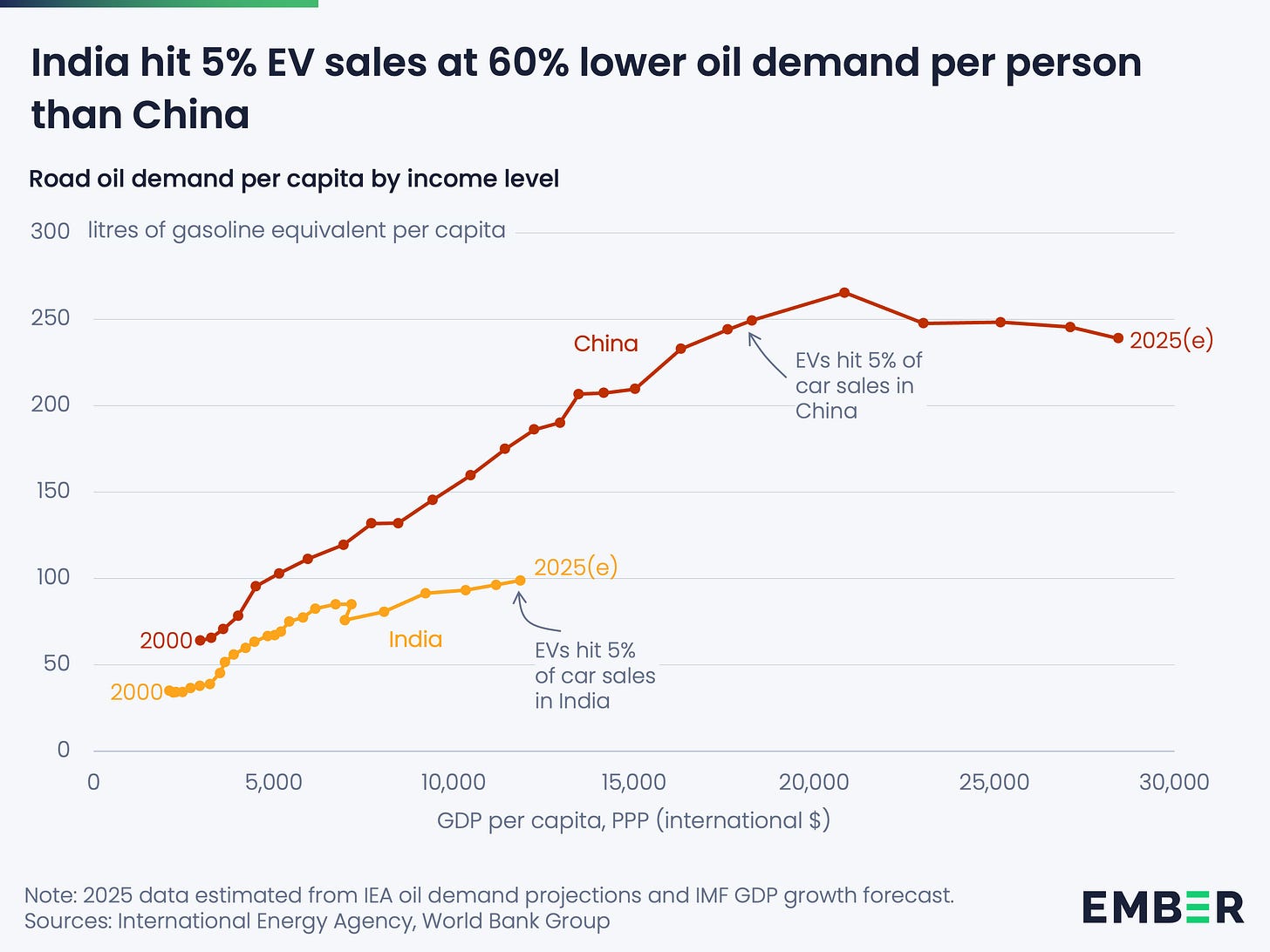 Electric cars exceeded 5% of sales in mid-2025, at a point when oil demand per capita is 60% lower than when China crossed the same threshold. In the three-wheeler category, India leads the world, with electric models now approaching 60% of sales. Two-wheelers are following fast: 1.25 million electric two-wheelers were sold in 2024, four times the number in 2020.