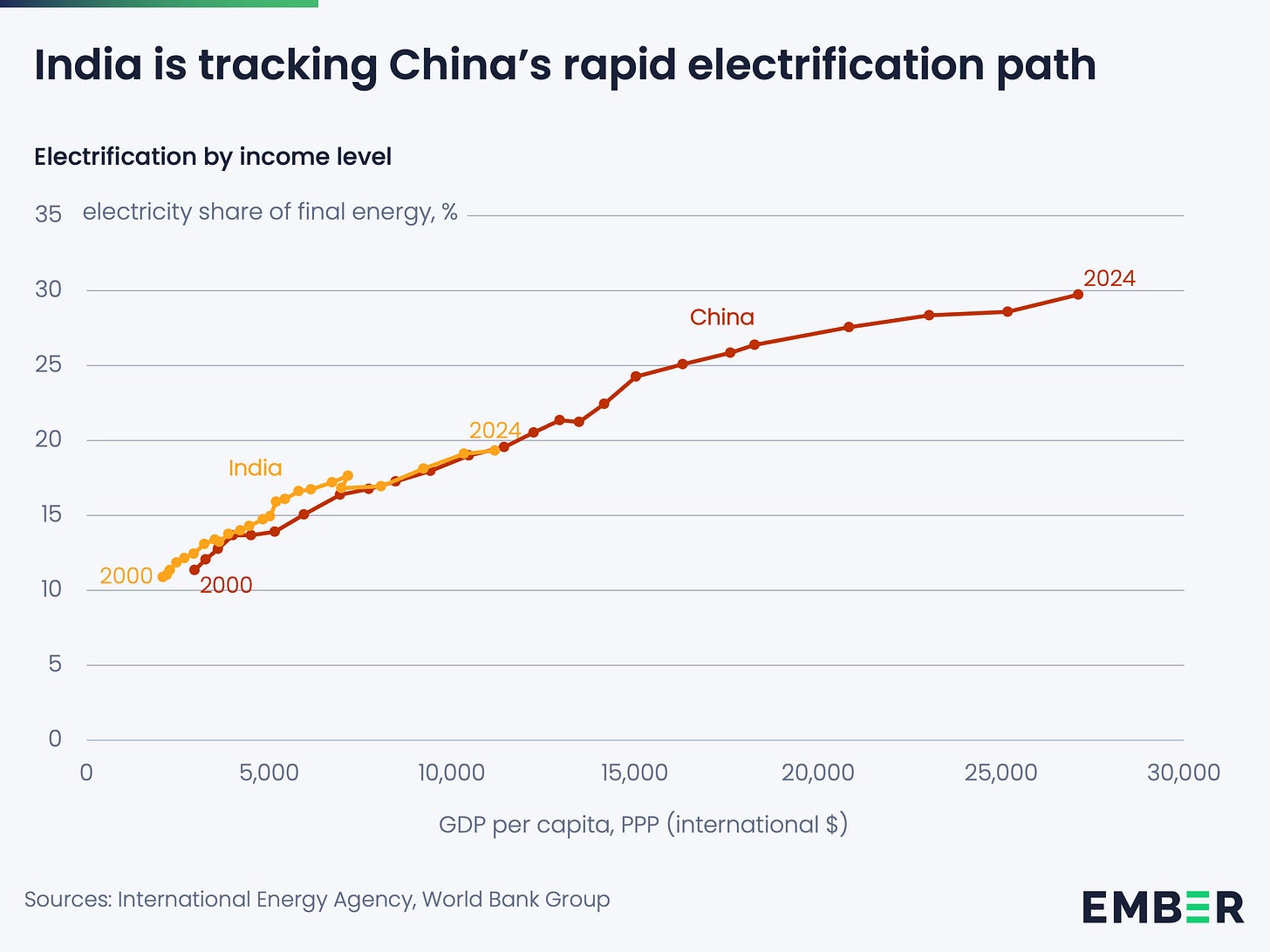 Several factors explain why India’s electrification rate is tracking China’s. Buildings are more electrified at equivalent stages of development, largely because India’s climate means temperature control is dominated by cooling – which is inherently electric – whereas China’s heating demand is met by a mix of electric and fossil fuels.