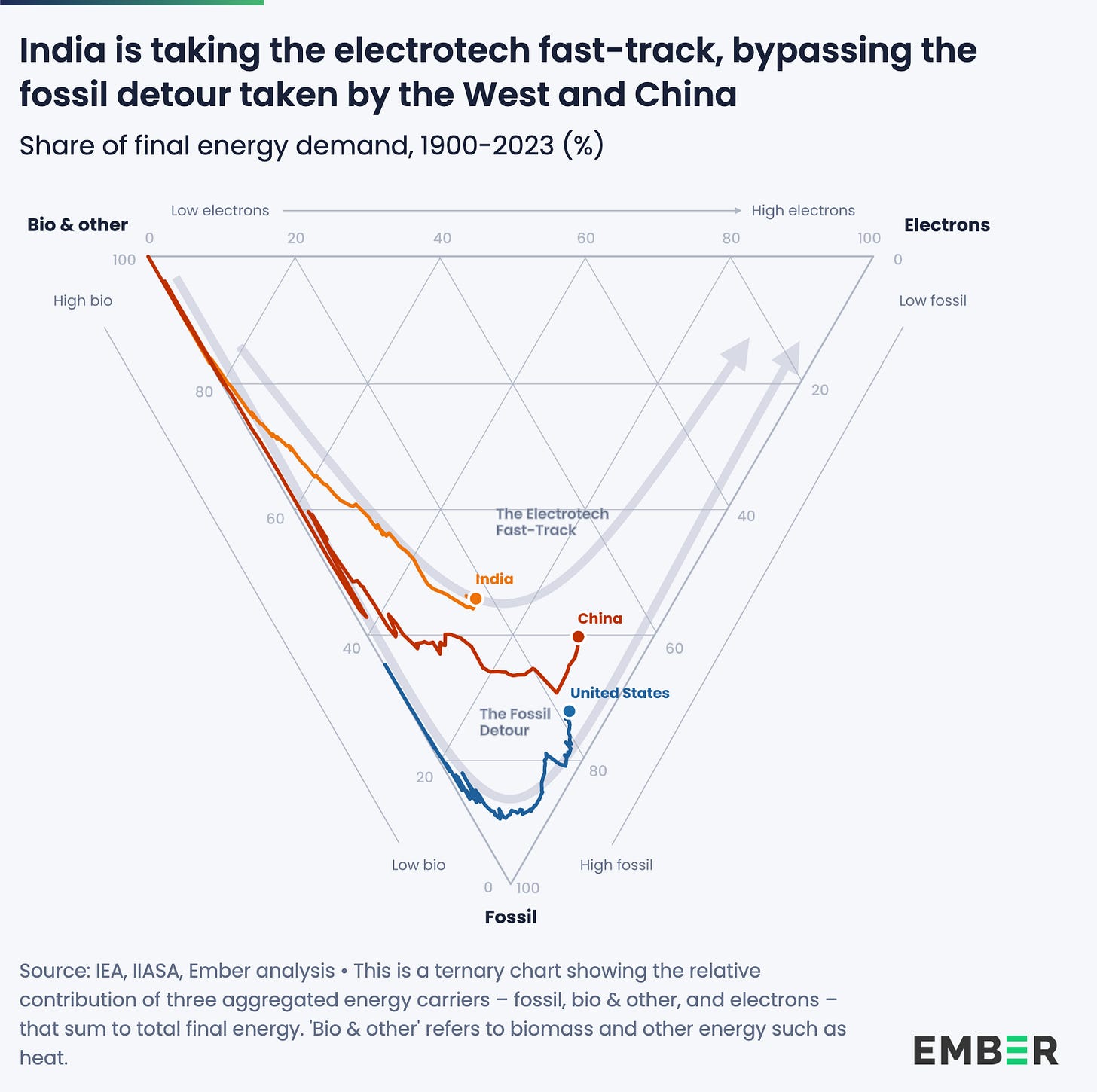 Overall, India is on a very different development pathway from China, industrialising on modern renewables, put to work through electrification. Leaning into this offers multiple advantages: manufacturing opportunities, energy sovereignty and faster scaling of electricity supply. As the fastest-growing major economy and the world’s most populous nation, India’s choices carry powerful demonstration effects. It is showing other emerging economies that electrotech can power industrial growth, not just follow it.